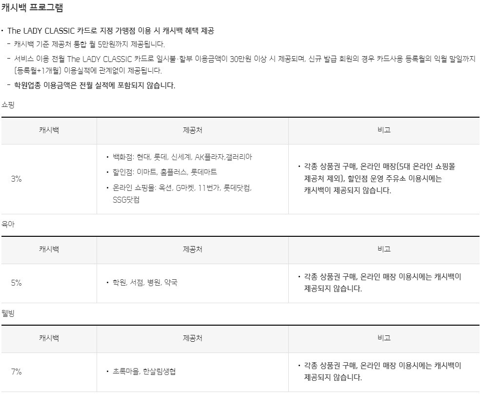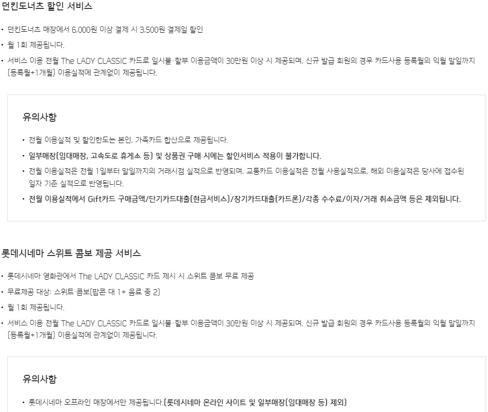 주요 장점: 쏠쏠한 캐시백 (특히 병원비는 할부도 적립된다 함), 롯데시네마 콤보, 던킨 할인 / 플래티넘 카드 혜택